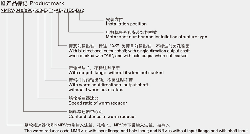 NMRV-蝸輪減速機代號NMRV為帶輸入法蘭,孔輸入,NRV為不帶輸入法蘭,軸輸入